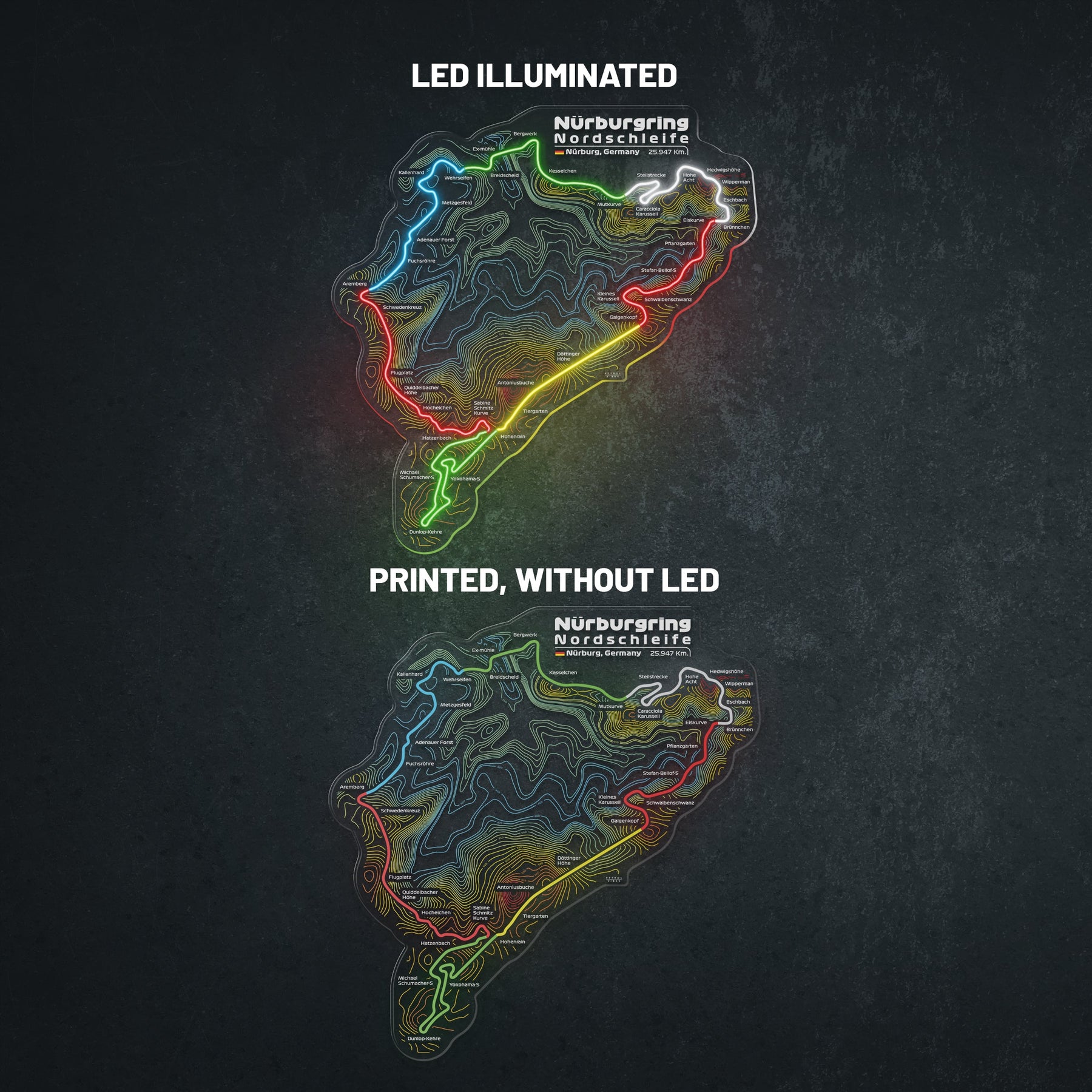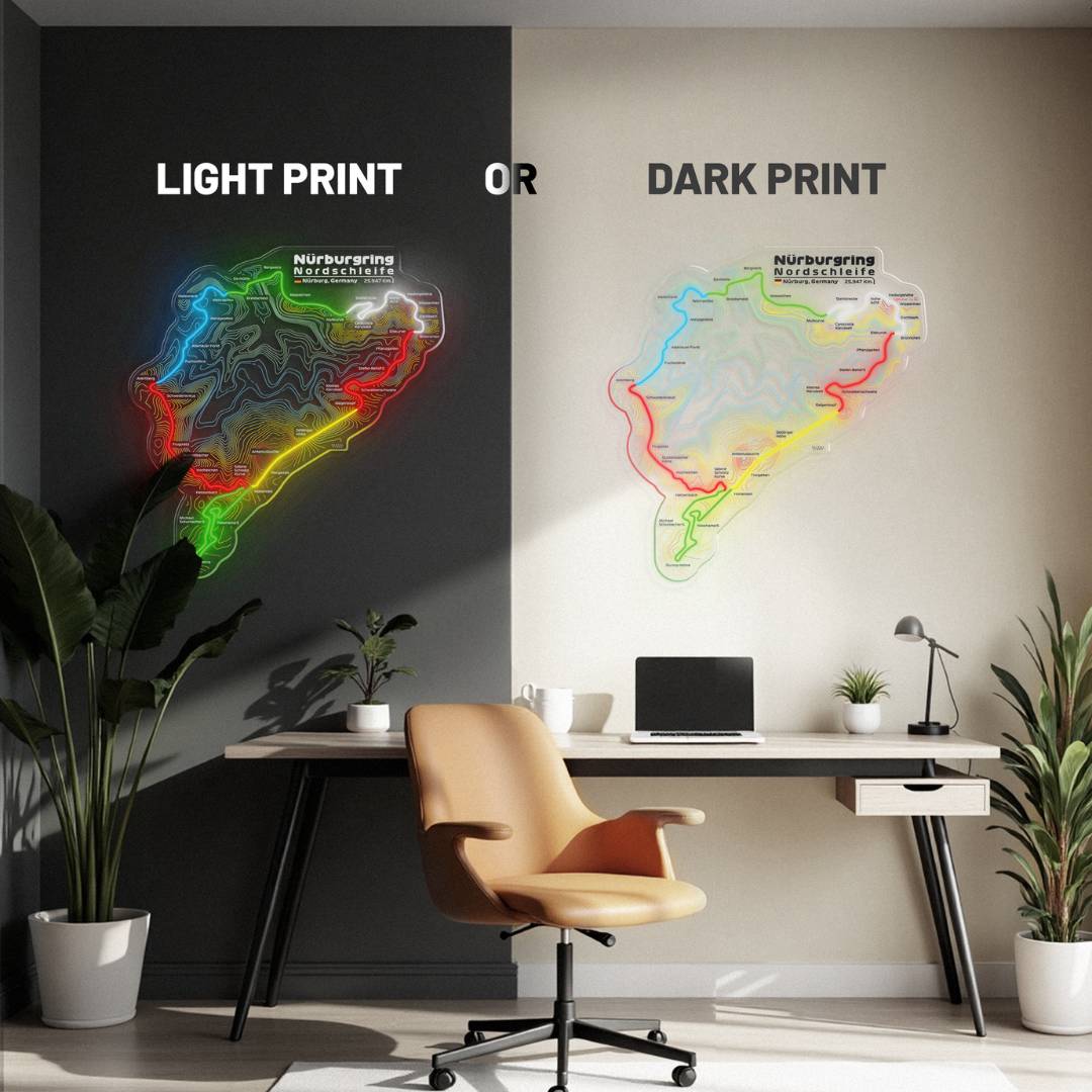 This Nürburgring Nordschleife LED Race Track silhouette will add a bright spark of light to any room. Each track features 5 flashy colors, the race track name alongside the distance and the country it's located in. It's the perfect way to add some color and improve the overall look while catching the attention of anyone, racing enthusiast or not.