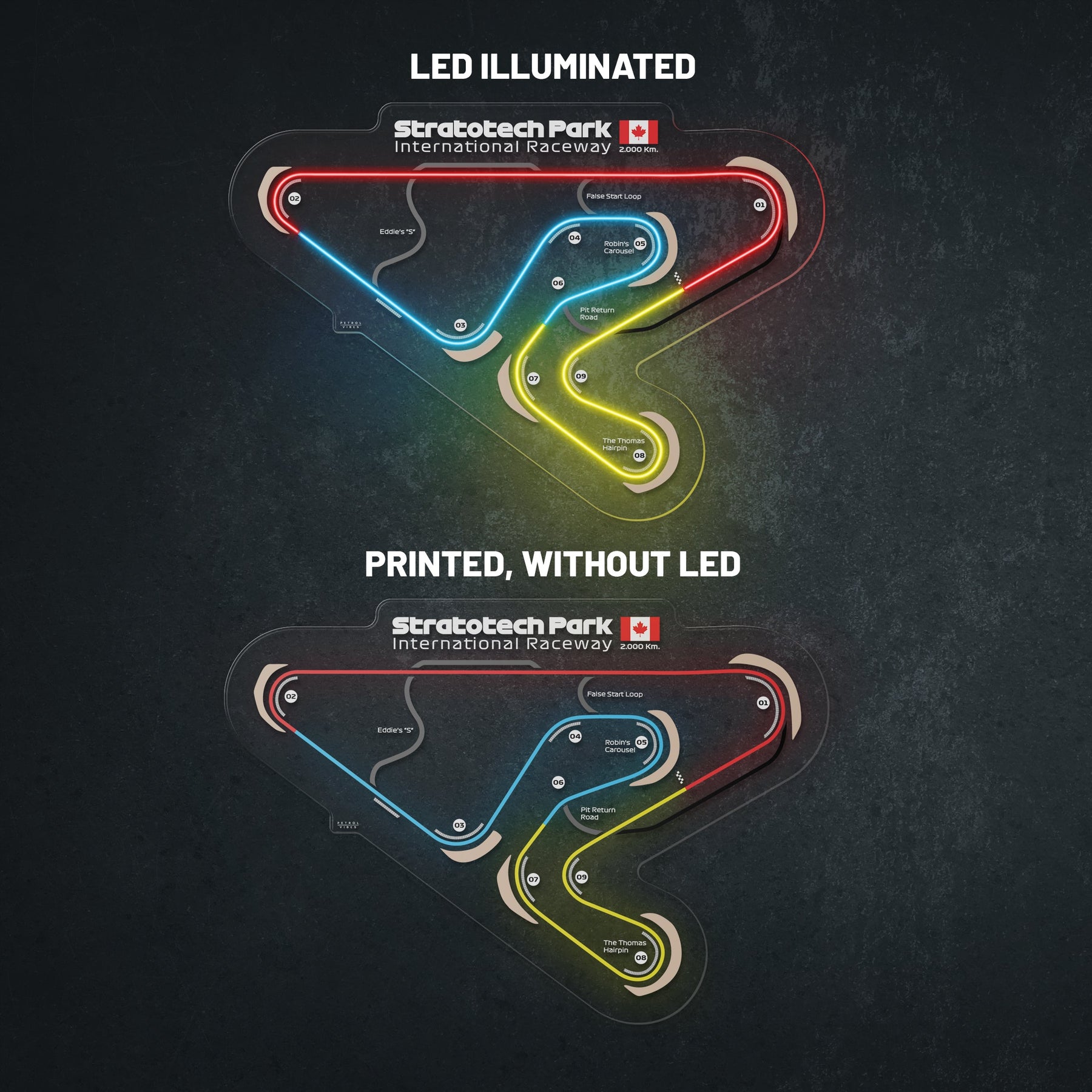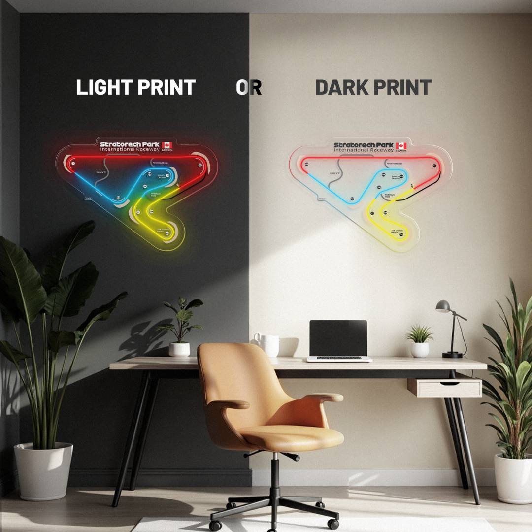 This Stratotech Park Raceway LED Race Track silhouette will add a bright spark of light to any room. Each track features the 3 iconic colors of Formula 1, the race track name alongside the distance and the country it's located in. It's the perfect way to add some color and improve the overall look while catching the attention of anyone, racing enthusiast or not.