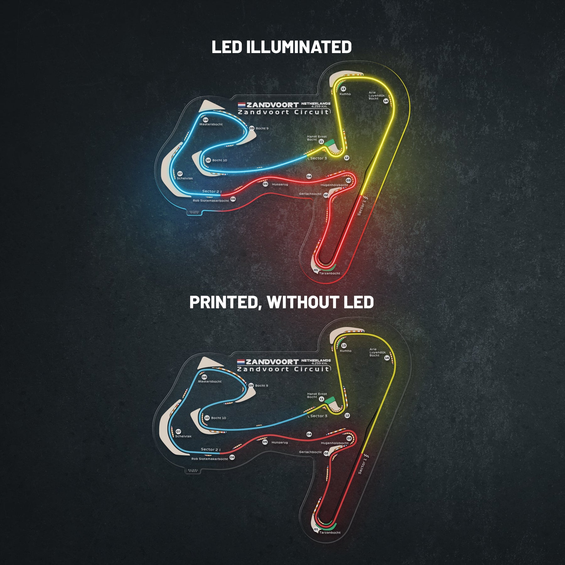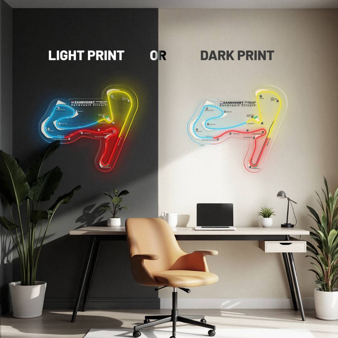 This Zandvoort Circuit LED Race Track silhouette will add a bright spark of light to any room. Each track features the 3 iconic colors of Formula 1, the race track name alongside the distance and the country it's located in. It's the perfect way to add some color and improve the overall look while catching the attention of anyone, racing enthusiast or not.